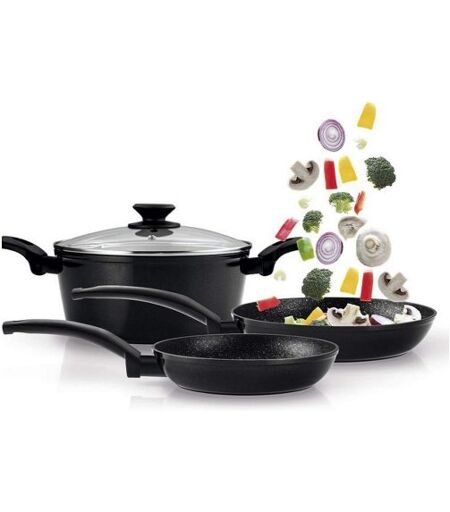 Design Und Widerstandsfähigkeit, Dieses Kochgeschirr Besteht Aus 2 Pfannen Und 1 Topf Mit Deckel. Es Zeichnet Sich Durch Ein Ansprechendes Design Mit Verarbeitung, Bedienkomfort, Qualität Und Haltbarkeit Aus. Antihaftbeschichtung, Geeignet Für Alle Herdarten, Pfoa-Frei, Unabhängig Von Ihrem Kochsystem - Elektro-, Gas-, Glaskeramik- Oder Sogar Induktionsherd. Eine Hochwertige Ilag-Antihaftbeschichtung. Der Dicke, Mehrschichtige Boden Verteilt Die Hitze Gleichmäßig Und Sorgt So Für Optimale Kochergebnisse.Funktionalität: Der Deckel Aus Gehärtetem Glas Mit Griff Und Das Dampfauslassventil Sorgen Für Optimalen Benutzerkomfort. Für Alle Arten Von Küchen Geeignet Die Pfannen Können In Allen Herdarten Verwendet Werden: Keramik, Elektro, Gas, Induktion, Sogar Im Backofen. Sie Sind Auch Spülmaschinenfest.   ...