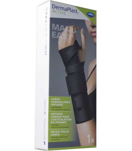 DERMAPLAST ACTIVE Manu Easy 2 long left Stabile Handgelenkorthese zur Ruhigstellung und erhöhten Stabilisierung des Handgelenkes. Mit anatomisch geformtem Stützstab und einhändig verschliessbaren Klettverschlussbänder. Die stabile, lange Handgelenkorthese dient der Immobilisation und erhöhten Stabilisierung des Handgelenkes. Durch den anatomisch vorgeformten Stützstab und die spezielle Formgebung der Orthese wird eine optimale Stabilisierung des Handgelenks mittels Fixierung ermöglicht, welche schmerzauslösende Bewegungen verhindert. Grössen Handgelenkumfang: - Size 1: 15-17 cm - Size 2: 17-19 cm - Size 3: 19-21 cm. Hersteller IVF HARTMANN AG ...