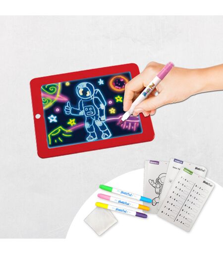 Ein Anwendungsvideo & zahlreiche nützliche Tipps zur Anwendung finden Sie hier – bitte klicken (https://www.youtube.com/watch?v=C9UY4R-xCpQ) Das ORIGINAL aus dem TV! Malen mit Magie! Magic Pad ist eine Maltafel mit 8 coolen Leuchteffekten im Tablet-Design. Die 3 Doppel-Neon-Farbstifte in 6 genialen Farben sorgen für superbunten Zeichenspaß. Die 30 Schablonen sind perfekt zum Ausmalen, Rechnen, Schreiben uvm. Sie können Magic Pad auch ideal als Notizbuch, Einkaufsliste, im Auto oder auch auf Reisen verwenden. Magic Pad fördert Phantasie, Kreativität, Lernbereitschaft und Hand-Augen-Koordination. Die Maltafel ist umweltfreundlich und kinderleicht zu reinigen, denn das mitgelieferte Reinigungstuch entfernt alles mit einem Wisch. ...