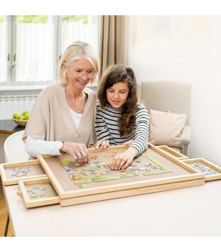 Holz Puzzle-Tisch für 500 Teile – Ordnung & Komfort für Puzzle-Fans Puzzeln entspannt, doch das Sortieren der Teile kann zur Herausforderung werden. Der Holz Puzzle-Tisch für 500 Teile schafft hier Abhilfe: Mit vier ausziehbaren Schubladen bietet er genug Platz, um Puzzle-Teile nach Farbe oder Form zu sortieren und übersichtlich zu verstauen. Die großzügige Innenfläche von 58 x 45 cm ist perfekt für Puzzles mit bis zu 500 Teilen. Viel Platz für Ihre Puzzle-Projekte Mit den kompakten Maßen von 65 x 49 x 4,5 cm passt der Tisch in jeden Raum und lässt sich bei Bedarf leicht verstauen. Trotz seiner Größe bietet er eine ausreichend große Arbeitsfläche für umfangreiche Puzzle-Projekte, ohne dabei unnötig viel Platz einzunehmen. Einfache Sortierung & Aufbewahrung Die vier ausziehbaren Schubladen bieten zusätzlichen Platz, um alle Puzzle-Teile übersichtlich zu sortieren. Nach Farben oder Formen geordnet, bleibt der Überblick stets gewahrt. Und wenn Sie eine Pause einlegen möchten, schließen Sie die Schubladen einfach und verstauen das angefangene Puzzle sicher. Robustes Design für langfristige Nutzung Der Tisch besteht aus 65 % Kiefernholz und 35 % mitteldichten Holzfaserplatten, was für Stabilität sorgt und den Tisch langlebig macht – ideal für den täglichen Einsatz. Angefangene Puzzles einfach verstauen Ihr Puzzle-Projekt muss unterbrochen werden? Kein Problem! Der Tisch lässt sich mitsamt dem begonnenen Puzzle sicher verstauen. Die geschlossenen Schubladen schützen die Teile und halten das Puzzle bereit, wann immer Sie weitermachen möchten. Holen Sie sich den Holz Puzzle-Tisch und machen Sie Ihre Puzzle-Abende noch angenehmer – alles ist ordentlich und griffbereit! ...