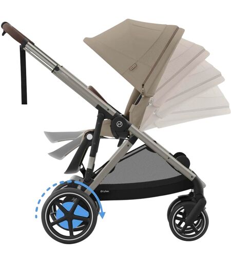Mit dem Kinderwagen e-Gazelle S von CYBEX geht es entspannt voran: Das Design überzeugt mit einem E-Antrieb und einem Multi-Terrain-Support. Eine dreistufige Wiegefunktion versüßt den Minis die Pausen mit einem sanften Schaukeln. Für ein besonderes Maß an Flexibilität ist der Wagen in über 20 Konfigurationen verwendbar. Altersempfehlung: ab 6 Monaten; ab Geburt mit Zubehör (separat erhältlich) Belastbarkeit: Mono-Variante 22 kg, Duo-Variante 2 x 22 kg, Einkaufskorb bis 13 kg, Shopper bis 10 kg Verwendung: geländetauglich; als Geschwister- und Zwillingswagen mit Zubehör (separat erhältlich); als Travelsystem mit Babyschale (separat erhältlich) Klappmaß: 77,5(L) x 66(B) x 36(T) cm Gewicht: 14,7 kg Räder: gefederte Kunststoffreifen, schwenk- und feststellbare Vorderräder Lieferumfang: Gestell mit Rädern und Korb, Sportsitz mit Verdeck und Spielbügel, Shopper, Batterie und Ladegerät Gestell: aufladbare Batterie, E-Antrieb, Multi-Terrain-Support, 3-stufige Wiegefunktion, höhenverstellbarer Schieber mit Bedienfeld und Sicherheitsschlaufe, Feststellbremse, kompakt zusammenfaltbar Sportsitz: gepolstertes 5-Punkt-Einhand-Gurtsystem, abnehm- und schwenkbarer Spielbügel, ergonomische Liegeposition, mehrfach verstellbare Rückenlehne, verstellbare Fußstütze, 3-fach höhenverstellbares, ausziehbares XXL-Sonnenverdeck mit Mesh-Fenster und UV-Schutz 50+, waschbare Bezüge Sicherheit und Komfort Der Kinderwagen e-Gazelle S von CYBEX bildet die Grundlage für besonders komfortable Spazierfahrten. Ein Elektromotor und ein Multi-Terrain-Support sorgen dafür, dass es selbst in unebenem Terrain stets kinderleicht vorangeht.Die Kleinen genießen den Komfort des wendbaren Sportsitzes. Er verfügt über einen mit einer Hand an das Kind anpassbaren 5-Punkt-Gurt und einen schwenk- und abnehmbaren Spielbügel. Seine Rückenlehne ist mehrfach neigbar, die Fußstütze lässt sich ebenfalls verstellen. Bei Bedarf steht den kleinen Passagieren so eine ergonomische Liegeposition zur Verfügung. Die Kids können sich entspannt zurücklehnen und das sanfte Schaukeln des Wagens genießen. Selbst wenn der e-Gazelle S geparkt ist, bietet ihnen die dreistufige elektrische Wiegefunktion eine kontinuierliche Bewegung. Das ausziehbare XXL-Verdeck des Kinderwagens schützt die Minis zuverlässig vor Wind und Sonne. Sein Mesh-Fenster stellt an warmen Tagen eine gute Luftzirkulation sicher. Die Möglichkeit der Höhenanpassung des Dachs überzeugt, wenn der Wagen als Duo-Variante genutzt wird. Gestell und Fahrwerk Das Gestell des e-Gazelle S beinhaltet mit dem Elektromotor das Herzstück des Wagens. Er lässt sich komfortabel über den höhenverstellbaren Schieber steuern. Ein intuitiv bedienbarer Hebel reguliert die Unterstützung und Geschwindigkeit des Wagens. Eine Bedienoberfläche bietet die Möglichkeit, die Wiegefunktion zu aktivieren oder den Motor an- und abzuschalten. Auch der Status des Akkus lässt sich hier ablesen. Seine Laufzeit ist von verschiedenen Faktoren wie der Bodenbeschaffenheit,... ...