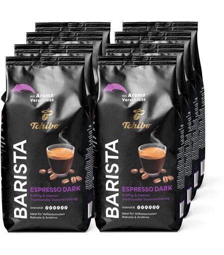 BARISTA Espresso Dark - 8x 1 kg Ganze Bohne Aufbewahrungshinweise: Aromaverpackung, Trocken, dunkel und vor Wärme geschützt lagern., Unter Schutzatmosphäre verpackt. Geschmack > Geschmacksprofil: Kräftig und intensiv Kräftig & intensiv mit feinen Aromen von gerösteten Nüssen sowie einer samtigen, dunklen Crema.Geschmackvoller Kaffee aus aromatischen Tchibo Arabica- und vollmundigen Tchibo Robusta-BohnenMit Aroma-Verschluss für optimale Aromafrische, ideales Dosieren und einfaches WiederverschliessenDieser Kaffee ist Teil des Tchibo KaffeeprogrammsTraditionell und schonend trommelgeröstetIdeal für Kaffeevollautomaten ...