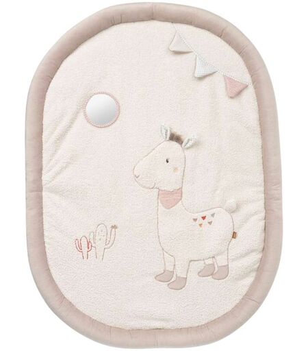 Die Erlebnisdecke Peru von Fehn mit einer Liegefläche aus verschiedenen Materialien und Oberflächen lädt das Baby zum Fühlen, Kuscheln und Spielen ein und fördert durch die 3-D verarbeiteten Figuren Lama, Bär, Kaktus und Berg zusätzlich den Tastsinn & die Hand-Auge-Koordination. Spielbogen mit 5 abnehmbaren Spielzeugen Größe: 80 x 105 cm ab Geburt mit Spiegel, Raschelpapier, Rassel, Quietsche, Softbeißer, Dingdong und Tierstimme inklusive praktischer Tragetasche Obermaterial: Bouclette, Softvelours, Stoff, Jersey – bei 30°C waschbar Eine versteckte Quietsche im Kaktus, das Zwitschern im Lama, das Raschelpapier in den Blättern und ein Glöckchen im Bären unterstützen den Spielspaß und die Aufmerksamkeitssteigerung des Babys. Darüber hinaus fördern weitere Spielmöglichkeiten auf der Kuscheldecke den Tast- und Hörsinn sowie die Motorik des Kindes. Mit der 3-D-Activity-Decke kann der Nachwuchs in verschiedenen Wachstumsphasen beim Spielen, Liegen, Krabbeln und Sitzen die Rücken- und Nackenmuskulatur spielerisch stärken. ...