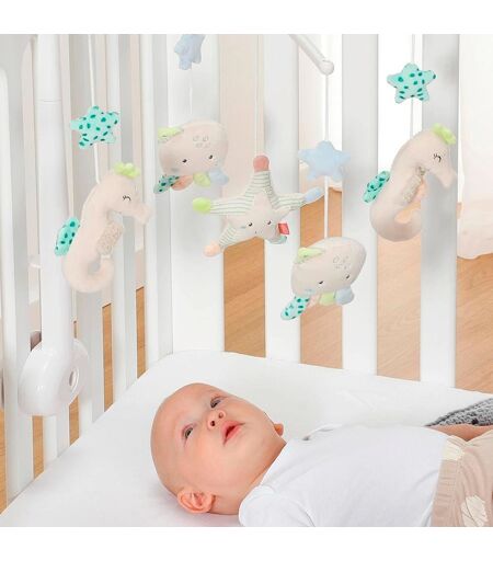 Das Musik-Mobile von Fehn ist dank der ruhigen Melodie von „Schlaf Kindlein Schlaf“ die ideale Einschlafhilfe. Musik-Mobile von Fehn aus der "Meereskinder"-Kollektion spielt die Melodie von "Schlaf Kindlein Schlaf" Spieldauer ca. 3-4 Minuten mechanisches Aufzieh-Spielwerk mit An/Aus-Schalter ab Geburt geeignet Die niedlichen Meeresbewohner drehen sich zur beruhigenden Melodie im Kreis und beruhigen so das Kleine zusätzlich. Dank praktischem An/Aus-Schalter kann das mechanische Mobile kinderleicht abgestellt werden. Die mitgelieferte Halterung lässt sich einfach und sicher am Bettchen oder Laufgitter befestigen. Praktisch: Die kleinen Meerestierchen können abgenommen und in der Waschmaschine gewaschen werden. ...