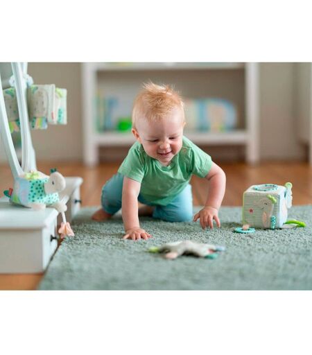 Der spannende Activity-Würfel von Fehn regt spielerisch die Sinne der Kleinen ab Geburt an. Activity-Würfel von Fehn aus der "Meereskinder"-Kollektion mit Rassel, Softbeißer, Raschelpapier, Spiegel, Glöckchen und Greifring Universalring zur Befestigung Obermaterial aus Velours, Jersey, Stoff und Druckstoff ab Geburt geeignet Mit dem spannenden Würfel können Babys spielerisch immer neue Dinge entdecken: Die Perlen-Rassel, das Raschelpapier und das Glöckchen im Inneren machen lustige Geräusche, der kleine Greifring lädt zum Fühlen und Tasten ein, der Softbeißer hilft bei Zahnungsbeschwerden und der Spiegel trainiert spielerisch die Selbsterkennung. Der Activity-Würfel fördert so spielerisch alle Sinne und fördert die Hand-Auge-Koordination der Kleinen. Dank dem praktischen Ring kann der Würfel sicher am Bettchen, Kinderwagen oder der Babyschale befestigt werden. ...