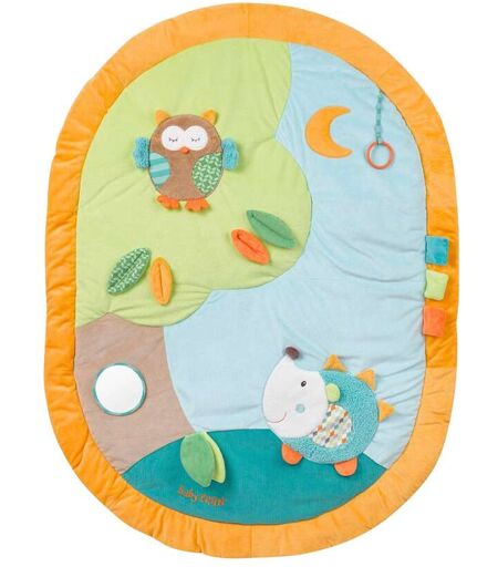 Die 3-D-Activity-Decke aus der Kollektion Sleeping Forest von Fehn ist der perfekte erste Spielplatz für kleine Weltentdecker. ab Geburt geeignet mit 5 abnehmbaren Spielsachen mit Rassel, Quietsche, Glöckchen, Spiegel, Raschelpapier und Tierstimme Größe: 80 x 105 cm Die Liegefläche lädt mit verschiedenen Materialien und Oberflächen zum Fühlen, Kuscheln und Spielen ein. Die an den Bögen angebrachten Spielzeuge sind für kleine Babyhände leicht zu greifen. Sie fördern den Greif- und Tastsinn sowie erste Hand-Auge-Koordination. Der Igel mit Quietsche, der Fuchs mit Ballrassel, die Eule mit Dingdong, das Häuschen mit Tierstimme und der Apfel mit Raschelpapier üben akustische Reize auf die Kleinen aus und sorgen dafür, dass sie spielerisch die Welt begreifen lernen. Dank der grünen Befestigungsringe sind die tollen Spielzeuge ganz einfach abnehmbar. Die farbenfrohen Bögen sind mit Steckschließen an der Decke fixiert und leicht abnehmbar. So kann Dein Baby die Decke in verschiedenen Wachstumsphasen zum Spielen, Liegen, Krabbeln und Sitzen benutzen. ...