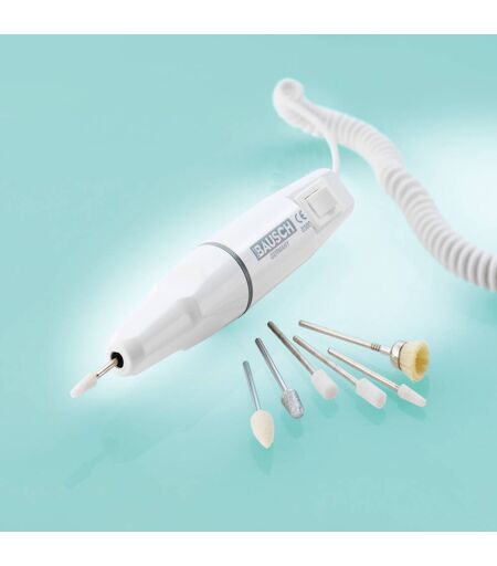 Mit dem 9-teiligen Maniküre-Pediküre-Set von Bausch lassen sich Hände und Füße auch zu Hause pflegen. Herzstück des Sets ist das mit einem starken Motor ausgestattete und leicht zu bedienende Handgerät, wie es auch in professionellen Kosmetikstudios zum Einsatz kommt. Auf die Spitze des Geräts lässt sich - je nach gewünschter Anwendung - eines der sieben im Lieferumfang enthaltenen Werkzeuge stecken. Dabei handelt es sich um einen Diamantfräser, zwei keramische Schleifstifte, zwei keramische Schleifzylinder, eine Topfbürste und einen Filzpolierer.Der Diamantfräser ist ein multifunktioneller Aufsatz. Er eignet sich unter anderem zum Kürzen und Abschleifen brüchiger oder sehr harter Nägel und zum Reduzieren von Hornhaut und Schwielen. Aber auch eingewachsene Nägel, Hühneraugen und Warzen lassen sich - Erfahrung vorausgesetzt - mit dem Diamantfräser behandeln. Die keramischen Schleifstifte und Schleifzylinder eignen sich ebenfalls zum Abschleifen von Nägeln und zum Entfernen überschüssiger Hornhaut an Fingerkuppen, Ballen und Ferse. Mit der Topfbürste ist es möglich, angelöste Nagelhaut zu entfernen und die Nageloberfläche zu polieren. Vor dem Lackieren der Nägel kann der Filzpolierer zum Einsatz kommen. Er sorgt für eine glatte Oberfläche, an der Lack gut haftet, eignet sich zum Beispiel aber auch zur regelmäßigen Anwendung, um Brüchen der Nageloberfläche vorzubeugen.Die Drehzahl des Handgeräts lässt sich abhängig von der Arbeit sechsstufig (von 3.000 bis 12.000 U/min.) regulieren. Niedrigere Drehzahlen sind sinnvoll, wenn es darum geht, präzise und vorsichtig zu arbeiten. Das ist zum Beispiel beim Entfernen der Nagelhaut oder beim Säubern der Nägel der Fall. Höhere Drehzahlen führen hingegen zu einem höheren Materialabtrag, wie er beim Fräsen von Hornhaut erwünscht ist. Durch die Einstellungsmöglichkeit der Drehzahl ist das Verletzungsrisiko sehr gering, weshalb sich das Maniküre-Pediküre-Set auch gut für Diabetiker eignet. Für eine flexible Bedienung ist das Netzteil mit einem 2,5 Meter langen Spiralkabel ausgestattet, das viel Bewegungsfreiheit erlaubt. ...