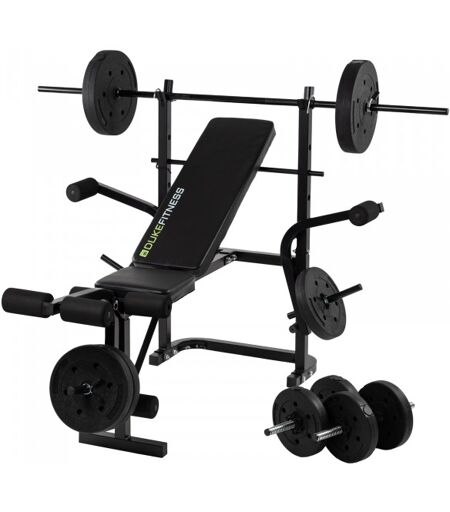 Duke Fitness Hantelbank Set: Preiswertes Komplett-Paket zum Einstieg ins Krafttraining Das Duke Fitness Hantelbank Set kommt mit allem, was Sie brauchen, um sofort mit dem Krafttraining loszulegen. Die Hantelbank hat eine eingebaute Hantelablage, die zum Beispiel fürs Schulterdrücken oder... ...