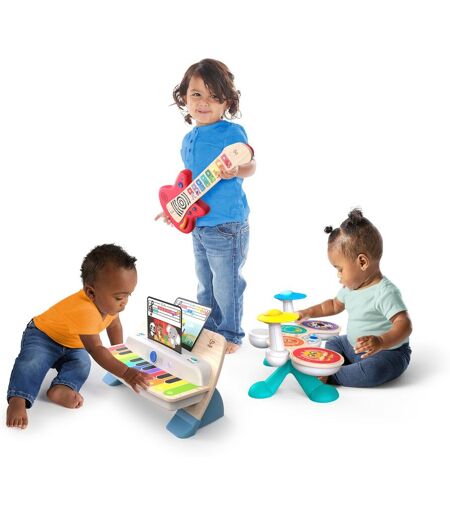 Mit dem Holzklavier Together in TuneTM von Hape entdecken Kinder ab sechs Monaten den Spaß an Musik und Tönen. Together in Tune PianoTM der Linie baby Einstein von Hape inkl. 5 Notenblättern und 10 Melodien 3 Spiel-Modi: Komponieren, kreatives Spiel und freies Spiel Tastatur mit magischer Cap-Touch-Oberfläche, Lautstärkeregler, "connect"-Funktion für Bandmodus ca. 35,5(L) x 17(B) x 18(H) cm aus Holz und Kunststoff ab 6 Monaten geeignet Kleine Nachwuchs-Musiker können mit dem Holzklavier ihre Liebe zur Musik entdecken. Das Spielzeug verfügt über drei verschiedene Spielmodi: Das Kind kann eingespeicherten Melodien lauschen oder selbst kreativ werden. Zudem bietet die "connect"-Funktion die Möglichkeit verschiedene Musikinstrumente der "Together in TuneTM"-Reihe miteinander zu koppeln und so die erste eigene kleine Band zu starten. Die Magic Touch Funktion der Tastatur lässt sich auch von kleinen Händen problemlos bedienen, da die Tasten nicht auf Druck reagieren, sondern auf Antippen der farblich markierten Flächen. Fünf Notenblätter mit zehn verschiedenen Liedern bieten erste Anregungen. Die Lautstärke des Pianos lässt sich über einen praktischen Regler einstellen. Hinweis Kann mit den Produkten der "Together in TuneTM"-Reihe verbunden werden. Diese sind separat erhältlich. ...