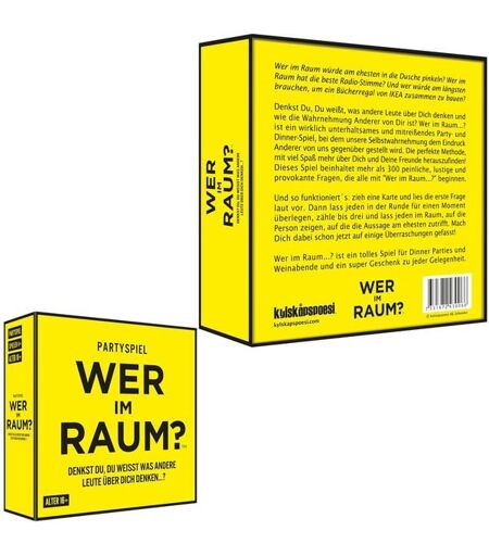 Wer im Raum würde am ehesten in die Dusche pinkeln und wer im Raum hat die beste Radio-Stimme? Wer im Raum würde in Badezimmerschränkchen anderer Leute schauen und wer würde am längsten brauchen, um ein Bücherregal von IKEA zusammen zu bauen? Denken Sie, Sie wissen, was andere Leute über Sie denken? Sind Sie sicher, dass Ihre Freunde Sie mit den selben Augen sehen, wie Sie sich selbst? Dieses Spiel wird Ihre Selbsteinschätzung unter Umständen verändern! Wer im Raum? ist ein wirklich unterhaltsames und mitreißendes Party- und Dinner-Spiel, bei dem unsere Selbstwahrnehmung und der Eindruck Anderer von uns einander gegenüber gestellt werden. Eine perfekte Methode, mit viel Spaß mehr über sich und seine Freunde herauszufinden! Das Spiel beinhaltet über 300 peinliche, lustige und provokante Fragen, die alle mit Wer im Raum? beginnen. ...
