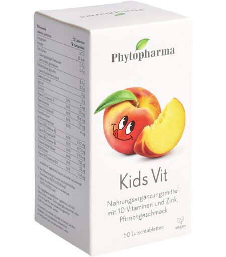 PHYTOPHARMA Kids Vit Lutschtabl 10 Vit&Zink; Nahrungsergänzungsmittel mit 10 Vitaminen und Zink, Pfirsichgeschmack. Produktdetails PHYTOPHARMA Kids Vit Lutschtablette ist ein speziell entwickeltes Nahrungsergänzungsmittel für Kinder ab 4 Jahren. Mit einem köstlichen Pfirsichgeschmack bieten diese Lutschtabletten eine Kombination aus 10 wichtigen Vitaminen und Zink, die zur Erhaltung der Gesundheit und des Wohlbefindens von Kindern beitragen kann. Eigenschaften Enthält 10 Vitamine und Zink zur Unterstützung des Immunsystems Angenehmer Pfirsichgeschmack, der von Kindern gut akzeptiert wird Vegan, laktosefrei und glutenfrei Frei von künstlichen Farbstoffen und Süßungsmitteln Praktische Verpackung mit 50 Lutschtabletten Hergestellt in Deutschland unter strengen Qualitätsstandards Die Zugabe von Zink und Vitaminen kann das allgemeine Wohlbefinden und die Gesundheit fördern, was besonders für wachsende Kinder von Bedeutung ist. Diese Punkte machen die Lutschtabletten zu einer idealen Ergänzung in der täglichen Ernährung. Inhaltsstoffe Traubenzucker (82 %), ganz gehärtetes pflanzliches Fett (Raps), L-Ascorbinsäure (Vitamin C), Maltodextrin, DL-α-Tocopherylacetat (Vitamin E), Zinkcitrat, Trennmittel Magnesiumsalze der Speisefettsäuren, Nicotinamid (Niacin), Säuerungsmittel Citronensäure, Calcium-D-pantothenat, Aroma, Pyridoxinhydrochlorid (Vitamin B6), Riboflavin (Vitamin B2), Thiaminmononitrat (Vitamin B1), Pteroylmonoglutaminsäure (Folsäure), D-Biotin, Cyanocobalamin (Vitamin B12). Anwendung Die empfohlene Einnahme beträgt für Kinder ab 4 Jahren täglich 1-2 Lutschtabletten. Für Jugendliche und Erwachsene wird die Einnahme von 2 Lutschtabletten pro Tag empfohlen. Hinweise Vor Kindern geschützt aufbewahren. Die angegebene empfohlene Tagesdosis sollte nicht überschritten werden. Nahrungsergänzungsmittel sind kein Ersatz für eine abwechslungsreiche und ausgewogene Ernährung sowie eine gesunde Lebensweise. Zusatzinfo Vegan, laktosefrei, glutenfrei. Hersteller Phytopharma SA ...