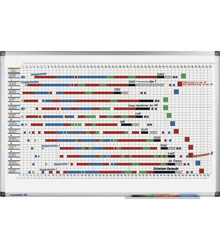 Jahresplaner Premium, 53-Wochen-Planung, vertikale Einteilung, BxH 900 x 600 mm. Anlieferung = teilzerlegt. Breite = 900 mm. Höhe = 600 mm. Tafelfarbe = weiß. Gewicht = 6.75 kg. Oberfläche = Stahl, lackiert. Produkttyp = Jahresplaner. 53-Wochen-Einteilung. Eloxierter Aluminiumrahmen. Magnethaftend, beschreibbar mit trocken abwischbaren Boardmarkern. Inkl. Zubehör-Set (Boardmarker-Set, 40 Etikettenträger, Montagematerial). Der Legamaster Jahresplaner Premium mit 53-Wochen-Einteilung bietet eine übersichtliche und effiziente Möglichkeit, Termine, Projekte und Ressourcen über das gesamte Jahr hinweg zu organisieren. Dank des magnethaftenden und trocken abwischbaren Designs lässt sich der Planer flexibel beschreiben und jederzeit aktualisieren - ideal für Büros, Teams und Organisationen. Der eloxierte Aluminiumrahmen sorgt für Stabilität und eine hochwertige Optik. Die großzügige Objektspalte (ca. H 11 x B 60 mm) sowie die Einzelfelder (ca. H 11 x B 15 mm) bieten ausreichend Platz für detaillierte Einträge. Eine 30 cm lange Markerablage stellt sicher, dass Stifte immer griffbereit sind. Zum Lieferumfang gehört ein umfangreiches Zubehörset (TZ111), bestehend aus einem 4er-Set Boardmarker, 40 Etikettenträgern (10 x 60 mm) mit weißen Einlegern sowie dem benötigten Montagematerial. Damit ist der Jahresplaner sofort einsatzbereit und vielseitig nutzbar. Ob zur Terminplanung, Schichtorganisation oder Projektverwaltung - dieser Premium-Planer von Legamaster ist die perfekte Wahl für eine strukturierte und professionelle Jahresübersicht. ...