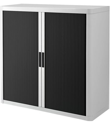 Rollladenschrank easyOffice®, 2 Fachböden, Höhe 1040 mm, weiß / schwarz. Anlieferung = teilzerlegt. Höhe = 1040 mm. Breite = 1100 mm. Tiefe = 415 mm. Korpusfarbe = weiß. Korpusmaterial = Metall, Polystyrol. Frontfarbe = schwarz. Eigenschaft = verschließbar. Rollladenmaterial = Polypropylen (PP). Innenausstattung = 2 Fachböden. Anzahl Fachböden = 2 Stück. Fachbodentraglast = 75 kg. Fachbodenfarbe = schwarz. Türart = Horizontal-Jalousie. Höhenverstellraster Böden = 80 mm. Innenbreite = 860 mm. Innenhöhe = 1000 mm. Innentiefe = 375 mm. 100% recycelbar, zu 85% aus recyceltem Material hergestellt. Design-Award-Gewinner. Sehr einfacher Aufbau ohne Werkzeug und Schrauben. Bietet eine optimale Einsicht, da sich die Rollläden sich komplett in die Seitenteile schieben lassen. Mit höhenverstellbaren Fachböden. ...
