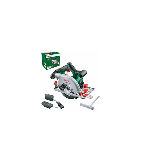 Die Akku-Handkreissäge UniversalCirc 18V-53 von Bosch bietet kabellose Freiheit, saubere Schnitte und eine stabile Schnittführung. Der Parallelanschlag sorgt für eine gerade Schnittlinie. Die UniversalCirc 18V-53 kann an jedem Arbeitsplatz eingesetzt werden, auch weitab von jedem Stromanschluss. Sie erzielt eine Schnitttiefe von 53mm beim Schneiden von Holz, Spanplatten und sonstigen Holzwerkstoffen und eignet sich ideal z.B. für den Bau von Regalen oder den Zuschnitt von Terrassendielen. Das hochwertige 160mm Sägeblatt mit 24 hartmetallbestückten Zähnen und die robuste Aluminiumschutzhaube gewährleisten exaktes und kraftvolles Sägen. Der Akku erreicht eine beachtliche Schnittkapazität von 33 Metern in 19mm Spanplatten pro Akkuladung (bei 2,5 Ah). Das nach vorn ausklappbare Sichtfenster "CutControl" dient der präzisen Führung der Kreissäge an der auf dem Werkstück aufgebrachten Schnittlinie. Das Sichtfenster hat je eine Markierung für den rechtwinkligen Schnitt und für den 45°-Schnitt. Die Schnitttiefe und der Neigungswinkel lassen sich einfach einstellen, und die Spindelarretierung der Säge ermöglicht einen einfachen Sägeblattwechsel. Für mehr Sauberkeit am Arbeitsplatz kann ein Staubsauger an den drehbaren Absaugadapter angeschlossen werden, so dass mehr als 90% des Staubs abgesaugt werden. Die Akku-Handkreissäge UniversalCirc 18V-53 ist Teil des 18V POWER FOR ALL-Systems. Ein einziger Akku kann für alle 18V POWER FOR ALL-Werkzeuge, auch von anderen Herstellern, verwendet werden. Die UniversalCirc 18V-53 ist außerdem mit dem Bosch Home & Garden Führungsschienen-System kompatibel, für präzise lange Schnitte und eine mühelose Schnittführung. Das System ist in der Länge um je 35cm erweiterbar. ...