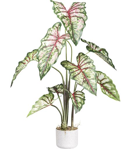 Künstliche Pflanze Syngonium, Melamintopf, Höhe 1000 mm. Höhe = 1000 mm. Behältnis = Melamintopf. Behälterfarbe = weiß. Behälterhöhe = 130 mm. Behälterbreite = 150 mm. Durchmesser Behältnis = 150 mm. Anzahl Blüten = 9 Stück. Produkttyp = Blattpflanzen. Farbenfrohe Dekopflanze mit realistischem Aussehen. Liebevoll der Natur nachempfunden. Langlebig und standortunabhängig. Erleben Sie die Schönheit der Natur mit unserer künstlichen Pflanze Syngonium. Mit einer stattlichen Höhe von ca. 100 cm ist sie das perfekte Dekorationselement, um jedem Raum ein grünes, lebendiges Ambiente zu verleihen. Trotz ihrer beeindruckenden Größe ist sie leicht zu handhaben und zu positionieren, da sie pro Stück verkauft wird. Diese Pflanze sticht durch ihre 9 einzigartigen Blätter in grünroter Farbgebung hervor, die sowohl natürlich als auch auffällig ist. Die Farbe ist langlebig und verblasst nicht, sodass Sie sich keine Sorgen über das Austauschen der Pflanze machen müssen. Genießen Sie die Ästhetik einer echten Syngonium-Pflanze, ohne sich um Pflege oder Bewässerung kümmern zu müssen. Diese künstliche Pflanze benötigt kein Wasser, keinen Dünger und keine Sonne und bleibt das ganze Jahr über frisch und lebendig. Diese Zimmerpflanze kommt in einem stilvollen weißen Melamintopf (15 x 13 cm) mit Erde, der sofortige Eleganz zu jeder Umgebung hinzufügt. ...