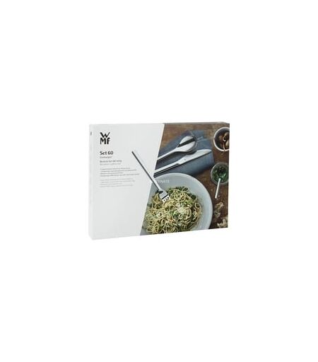 Das 60-teilige WMF Besteck-Set Palma ist für zwölf Personen ausgelegt und bietet passend zu zahlreichen Speisen und Gängen je zwölf Menügabeln, -messer und -löffel sowie Kuchengabeln und Kaffeelöffel. Die 60 Teile sind eine gute Basis für tägliches Speisen und können mit weiteren Servier- und Ergänzungsbestecken vervollständigt werden, für eine vollendete Tischkultur. Ob im Alltag in modernem Ambiente oder zu traditionellem Porzellan, das WMF Besteck Palma passt immer. Neutral im Design strahlt es mit seinen sanft geschwungenen Linien und gefälligen Proportionen schlichte Eleganz aus. Auffällig ist die markant abgesetzte Messerklinge des Monoblocmessers. Das hochglanzpolierte Besteck aus Cromargan Edelstahl Rostfrei 18/10 mit geschmiedeten Messern ist spülmaschinenfest, stoßresistent, rostfrei und mit seinem umfangreichen Ergänzungsangebot eine gute Wahl für jeden Haushalt. ...