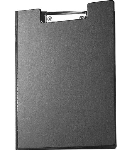Schreibmappe, Folienüberzug und Deckel, HxBxT 319 x 229 x 13 mm, VE 12 Stk, mit Aufhängeöse. Anlieferung = montiert. Format = DIN A4. Länge = 319 mm. Breite = 229 mm. Farbe = schwarz. Material = Karton. Oberfläche = Folienbeklebung. Höhe = 13 mm. Klemmweite = 8 mm. Ausführung = mit Deckel. Produkttyp = Schreibmappen. Mappe aus Karton mit Folienüberzug. Flache Bügelklemme mit Griffmulde. Mit einschiebbarer Aufhängeöse zum Aufhängen. Innentasche im Deckel zum Verstauen von Blättern oder Visitenkarten. Mit Stifteschlaufe, damit der Stift nicht herunterfällt oder verloren geht. ...
