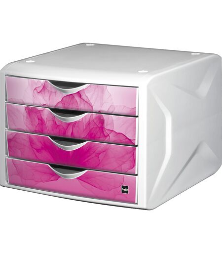 Schubladenbox, HxBxT 212 x 262 x 330 mm, VE 5 Stk, Schubladendesign wild flower. Anlieferung = montiert. Höhe = 212 mm. Breite = 262 mm. Tiefe = 330 mm. Für Papierformat = DIN A4. Material = Polypropylen (PP). Gehäusefarbe = weiß. Anzahl Schubladen = 4 Stück. Schubladenfarbe = pink. Schubladen-Innenmaße = 37x225x305 mm. Produkttyp = Schubladenboxen. Attraktives Design für eine moderne Büroumgebung. Robust aufgrund bruchfesten Polypropylens. Hochwertiger, unlösbarer, kratz- und stoßfester Druck. Bringen Sie frischen Wind ins Büro mit der dekorativen, stapelbaren Schubladenbox. Sie verfügt über vier Schubladen für DIN-A4-Dokumente, die mit einer Auszugssperre ausgestattet sind. Die formschöne Griffmulde ist jeweils in der Mitte angebracht. Schubladen-Abmessungen HxBxT 37 x 225 x 305 mm. Ab einer Abnahmemenge von 800 Stück können die Boxen individuell mit Logos, Motiven oder nach Ihnen Vorgaben bedruckt werden. ...